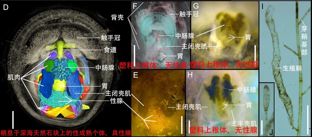 其中只有少数成员能够完成整个繁殖周期。在优势“大佬”腕足类群中,没有发现具有性腺的成熟个体。也就是说它们是“没有长大的孩子们”,以稚体的形式栖息在大型塑料薄膜上,这可能对于它们的繁殖、扩散没有任何贡献,因为它们尚不能完成代代相传的任务。