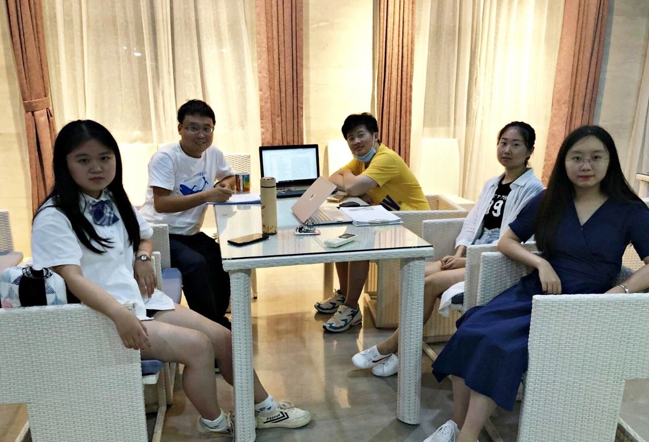 >>>研究人员讨论现场,左一王雨男、左二宋希坤、左三陈浩宇、右二顾张杰、右一顾依帆<<<