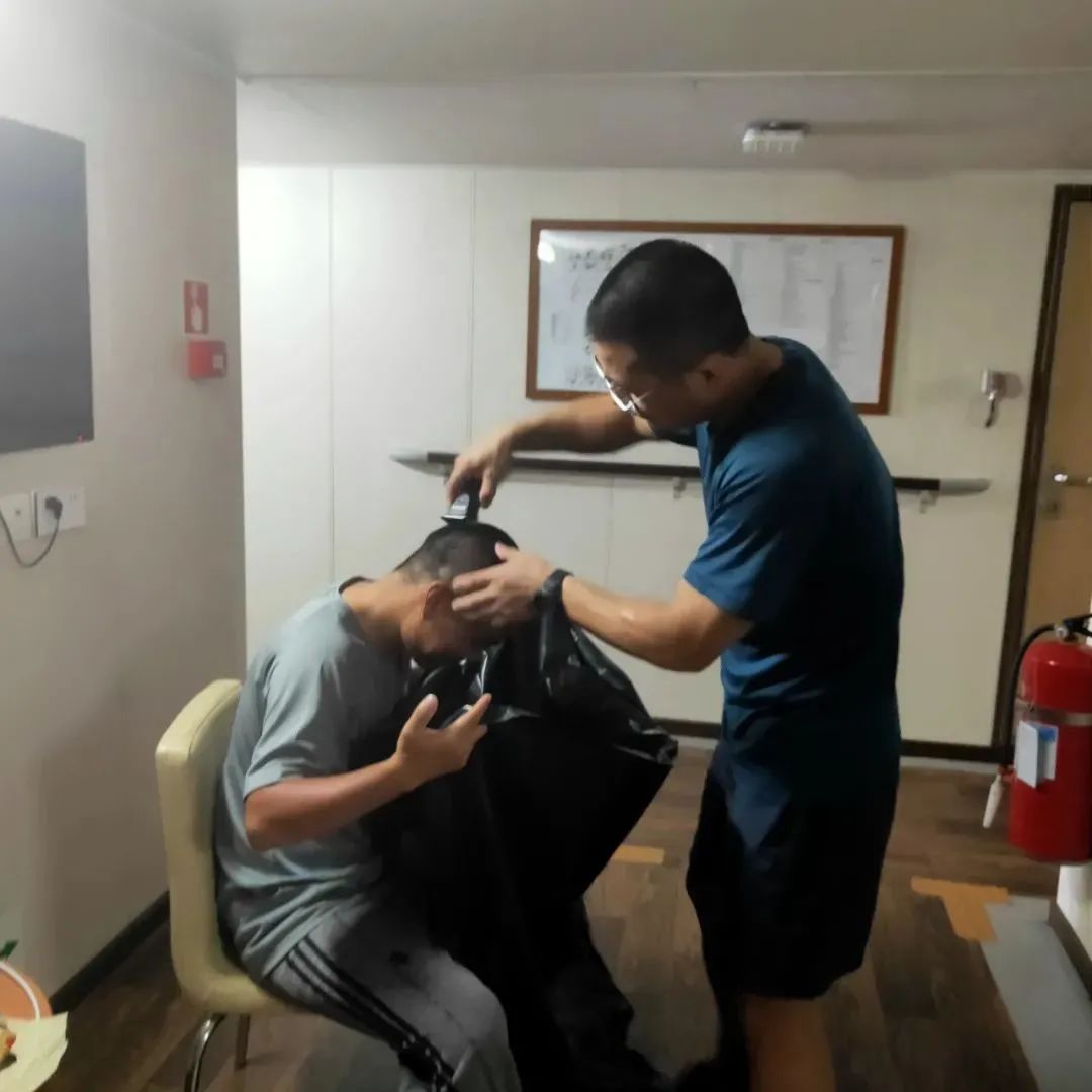 为了‘节约洗发水’,在首席科学家的带领下,全船八九个小伙伴都剃了光头,照片放了会挨打,这里放一张Tony叶工作的照片(拿着垃圾袋的正是YU博士),Tony师傅手法娴熟,二三分钟就可以搞定一个。