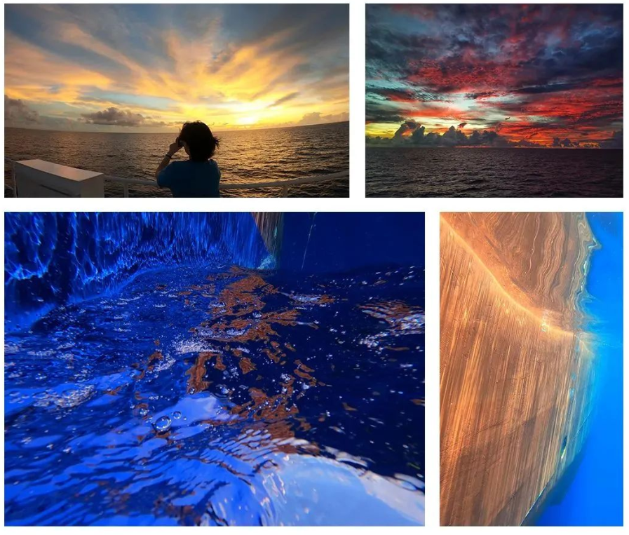 除了娱乐,海洋上壮丽的景观也可以抚平航次科考任务所有的劳累和辛苦。譬如海上的日出和日落、绚丽的彩虹、抑或水中的翩翩光影。然而大自然的美丽,不身临其境是无法深刻体会和感受,这些照片也仅仅揭开了其冰山的一角。