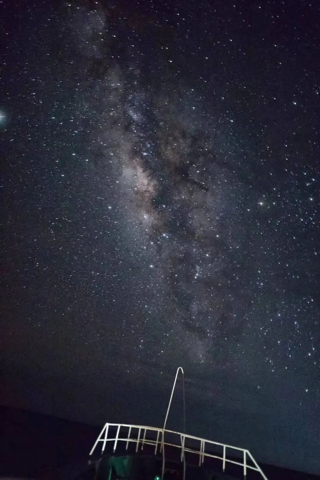而且,相比城市的大气(光)污染,广袤清新的海洋是观看银河的最佳场所。漫天星辰,围绕着我们的蓝舟,看不到边际。无数星星组成的银河,每个人看到都会觉得宇宙浩瀚,以及人类的渺小。犹记得有一夜,一堆小伙伴在黑灯瞎火的前甲板一起看银河,刚出舱门,感觉天上的星星也不过如此,但是当在黑暗中静静地停留几分钟后,眼睛逐渐适应了黑暗,再一抬头,整片银河一览无余,除了震撼不知道该说什么。小伙伴们争相拍照,奈何手机都不给力,拍不出想要的赶脚,照片里都只有黑黑的背景和几个星星点缀。这里借用一张朋友在南海拍摄的银河照片,可以告诉你们的是,西太平洋上观察到的银河毫不逊色。银河中也时时有流星闪过,小伙伴们想着许愿,奈何流星总是一闪而过,只有一刹那的流光,伴随着小伙伴们的叹息声,愿望又没来得及许(更别说拍照了...拍照估计也拍不出来...)。