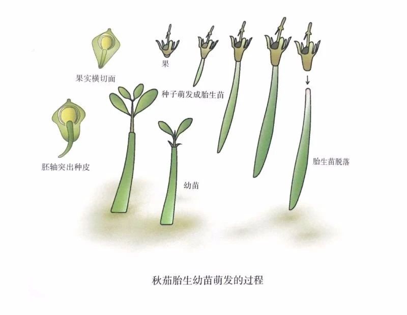 下图是秋茄胚轴的发育过程。胚轴在母树上发育的阶段就不断完善自身的一些生理和形态的特征,为从母树上跌落至滩涂逆境做准备。