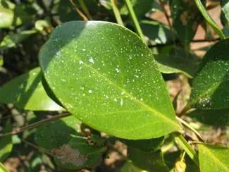 叶片上白色的就是盐腺分泌出来的盐,结晶在叶片表面