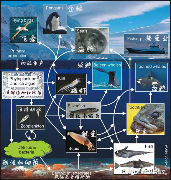 这些冰间湖区域由于未被海冰覆盖,日照相对充足,因此生长着众多的浮游植物,是南极食物链的基础,如大名鼎鼎的磷虾就以此为食。另外中国第36次南极科考还发现了阿蒙森海冰间湖是侧纹南极鱼的产卵场和育幼场。而磷虾和鱼类又是海鸟、企鹅、海豹、鲸等食物链上层大型动物的主要食物,这些生物在这里构成了一条非常典型的食物链。
