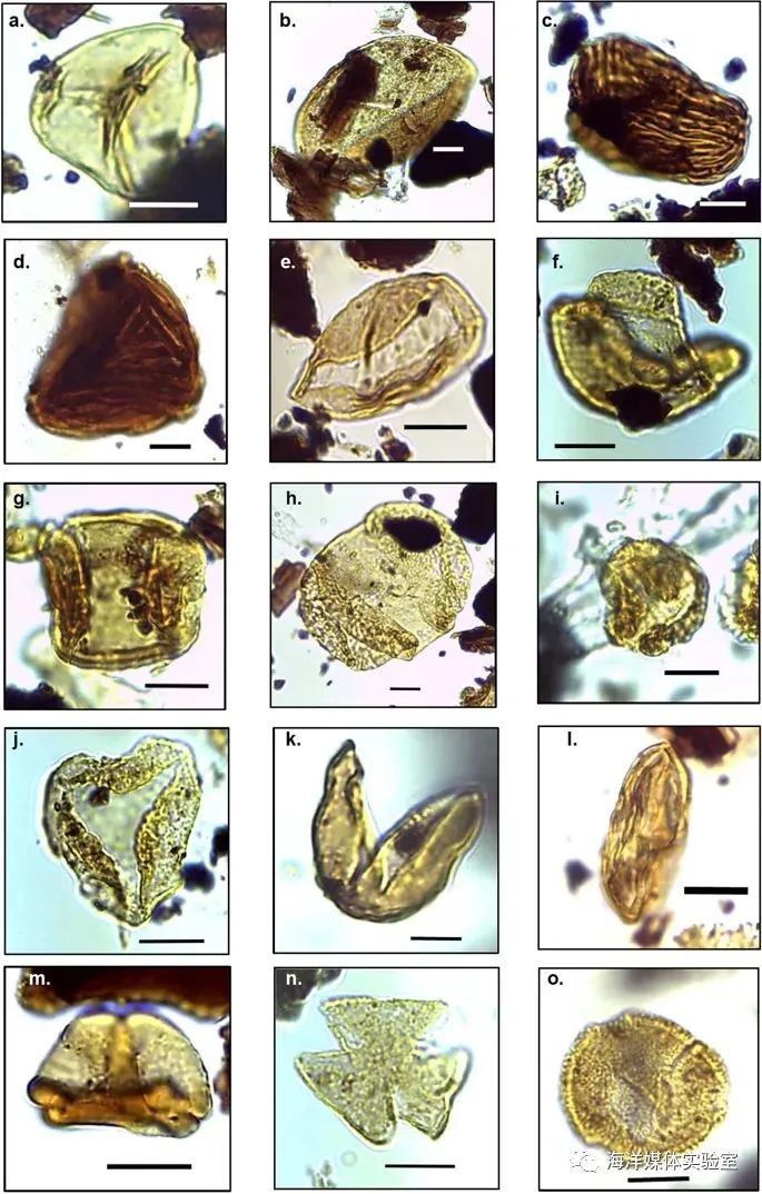 其次,众多被尘封在沉积物中的生物,如花粉、孢子、树根等,均可以给我们带来不可思议的信息。高纬度地区代表性的硅质沉积物,即为硅藻的残骸。硅藻在生长的时候,它的种类、数量还有组合特征等等,都会因为水体的物理、化学条件的差异而不同 , 所以可以通过沉积物柱中硅藻化石的特征,来推断相应的古海洋环境和古气候条件。