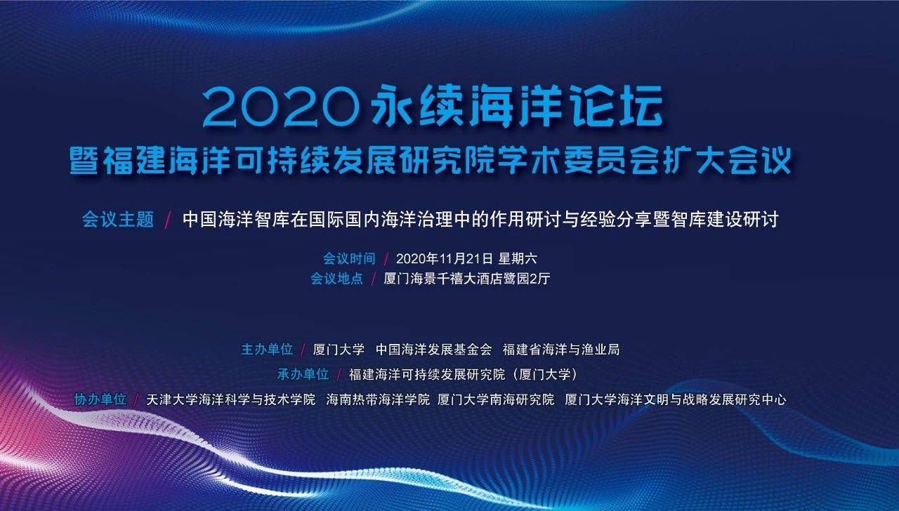 11月21日,2020永续海洋论坛暨福建海洋可持续发展研究院学术委员会扩大会议在厦门海景千禧大酒店召开。来自全国20多个科研院所、政府部门的专家学者齐聚鹭岛,对海洋智库在国际国内海洋治理中的作用展开研讨、分享经验,并探讨海洋智库的建设。苏纪兰院士、戴民汉院士、洪华生教授、潘新春教授等多个海洋界资深专家出席此次会议,福建省海洋与渔业局副局长翁新平为论坛致开幕辞。厦门大学党委副书记、纪委书记全海教授宣布了海研院学术委员会的成立并发表讲话。