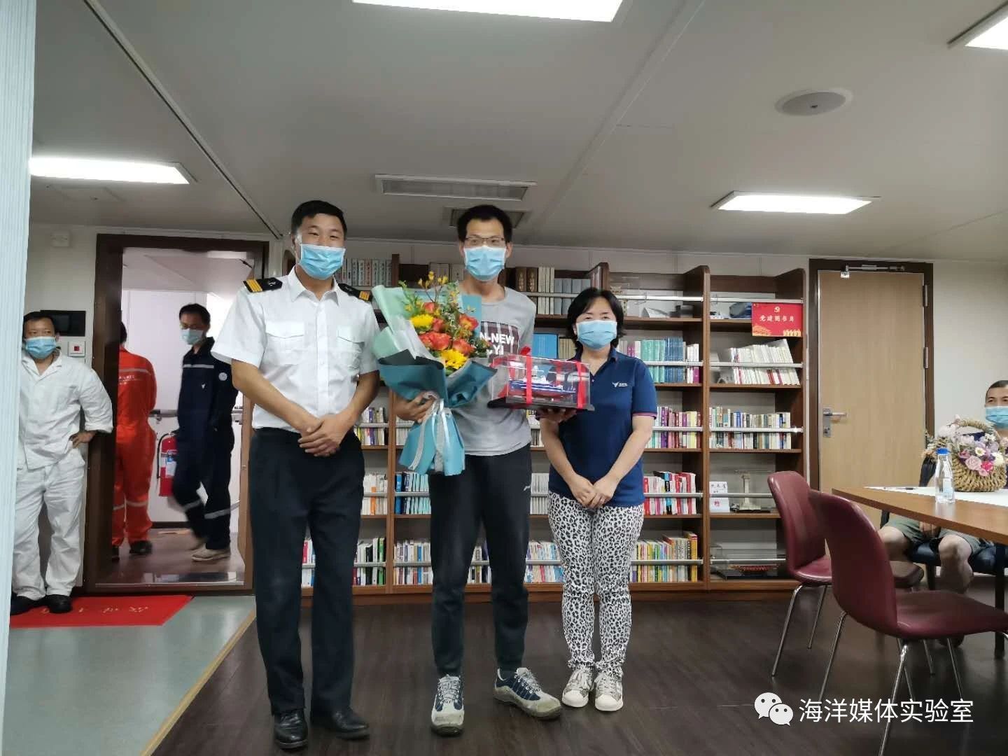 科考任务完成之际,正值520,尹龙船长和郭香会首席为科考队员和船员献上鲜花。