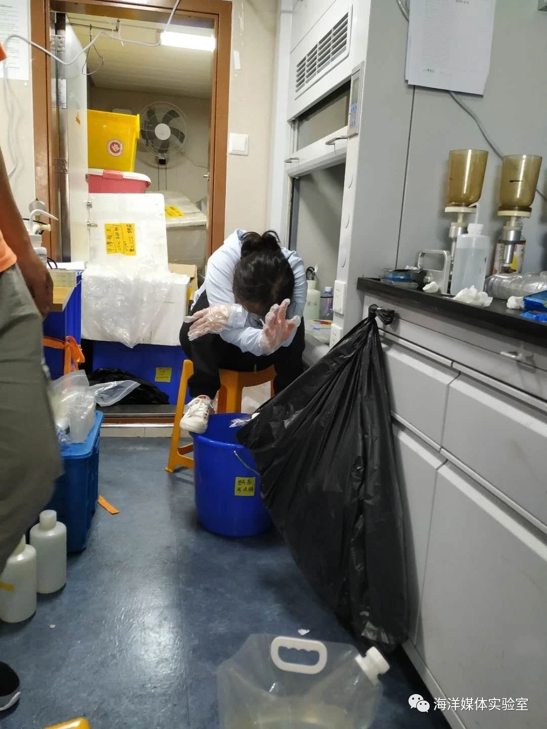 个别队员晕船严重,恶心呕吐,但并没有退缩,在自己的工作台附近放上一个垃圾桶,随时防备。在稍稍缓和之后,又重新投入到与样品的战斗中。