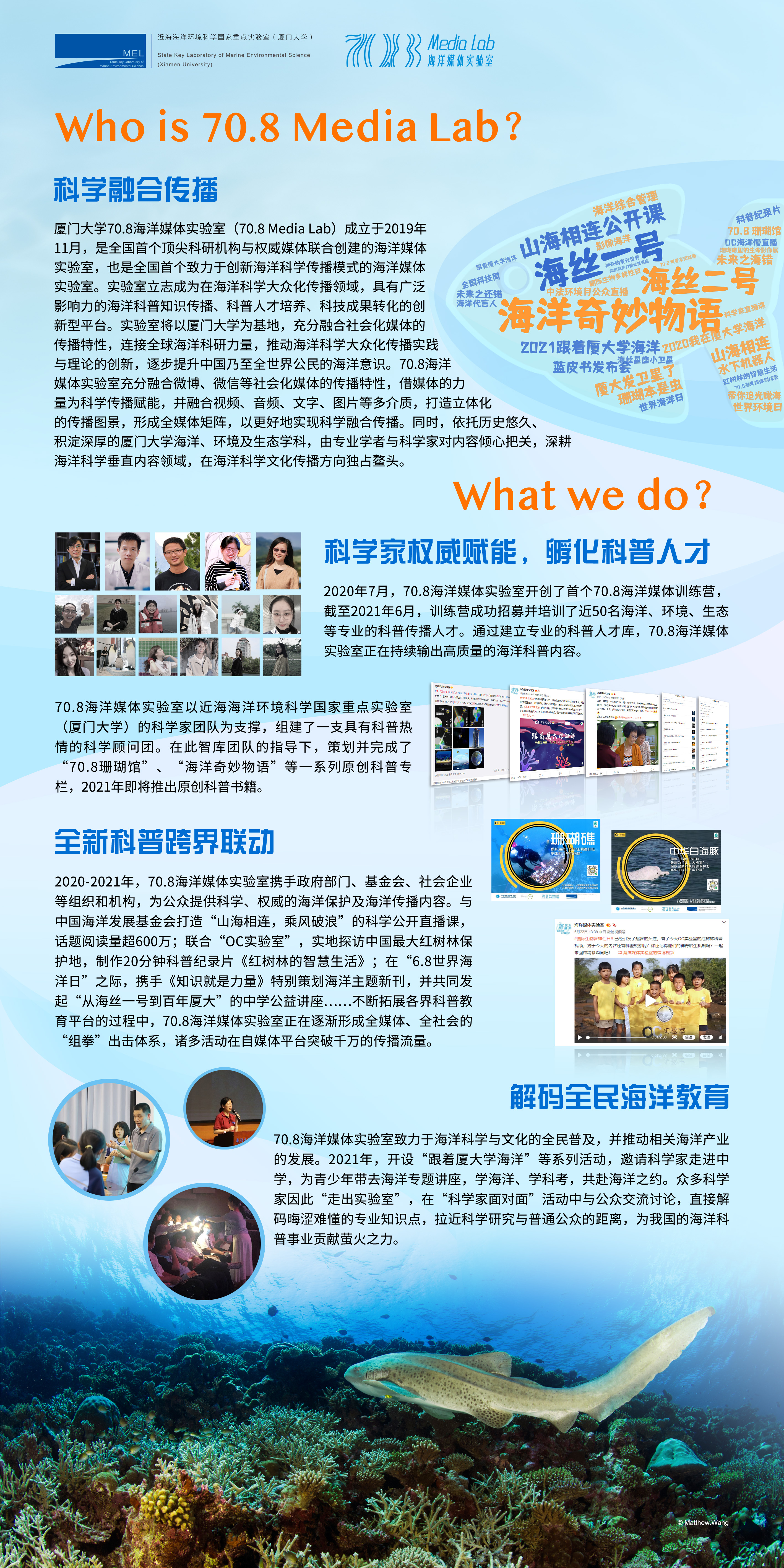 厦门大学70.8海洋媒体实验室(70.8 Media Lab)成立于2019年11月,是全国首个顶尖科研机构与权威媒体联合创建的海洋媒体实验室,也是全国首个致力于创新海洋科学传播模式的海洋媒体实验室。实验室立志成为在海洋科学大众化传播领域,具有广泛影响力的海洋科普知识传播、科普人才培养、科技成果转化的创新型平台。实验室将以厦门大学为基地,充分融合社会化媒体的传播特性,连接全球海洋科研力量,推动海洋科学大众化传播实践与理论的创新,逐步提升中国乃至全世界公民的海洋意识。