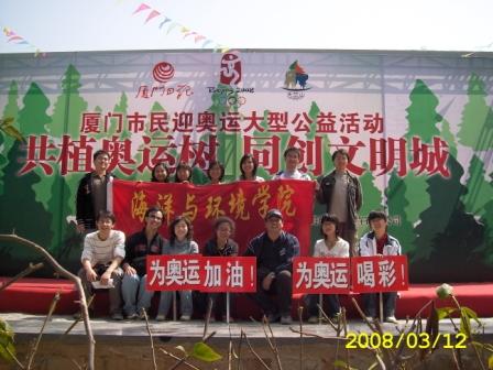 3月12日早上9点,春光和煦,厦门大学海洋与环境学院、近海海洋环境科学国家重点实验室的20名学生代表在环境生态学研究室主任卢昌义教授、院辅导员黄德强的带领下,与厦门市近千名群众代表共同参与了在天竺山森林公园举行的“共植奥运树,同创文明城”的迎奥运大型公益活动。