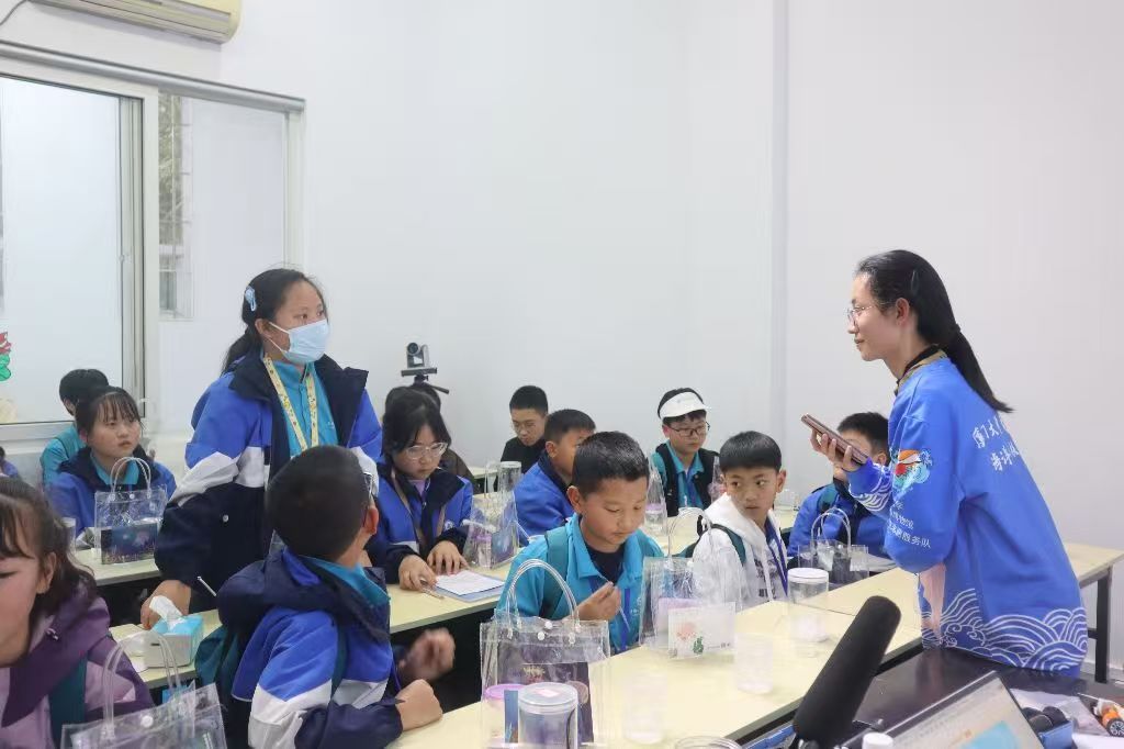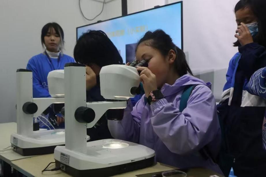 在水母实验环节中,志愿者组织孩子们分组开展海水调配、盐度测试和水母观察实验。孩子们配海水、测浓度,用显微镜细心观察丰年虾幼体、水母形态和进食并仔细记录,通过动手操作、亲身体验点燃了热爱科学、参与科普的兴趣和热情。