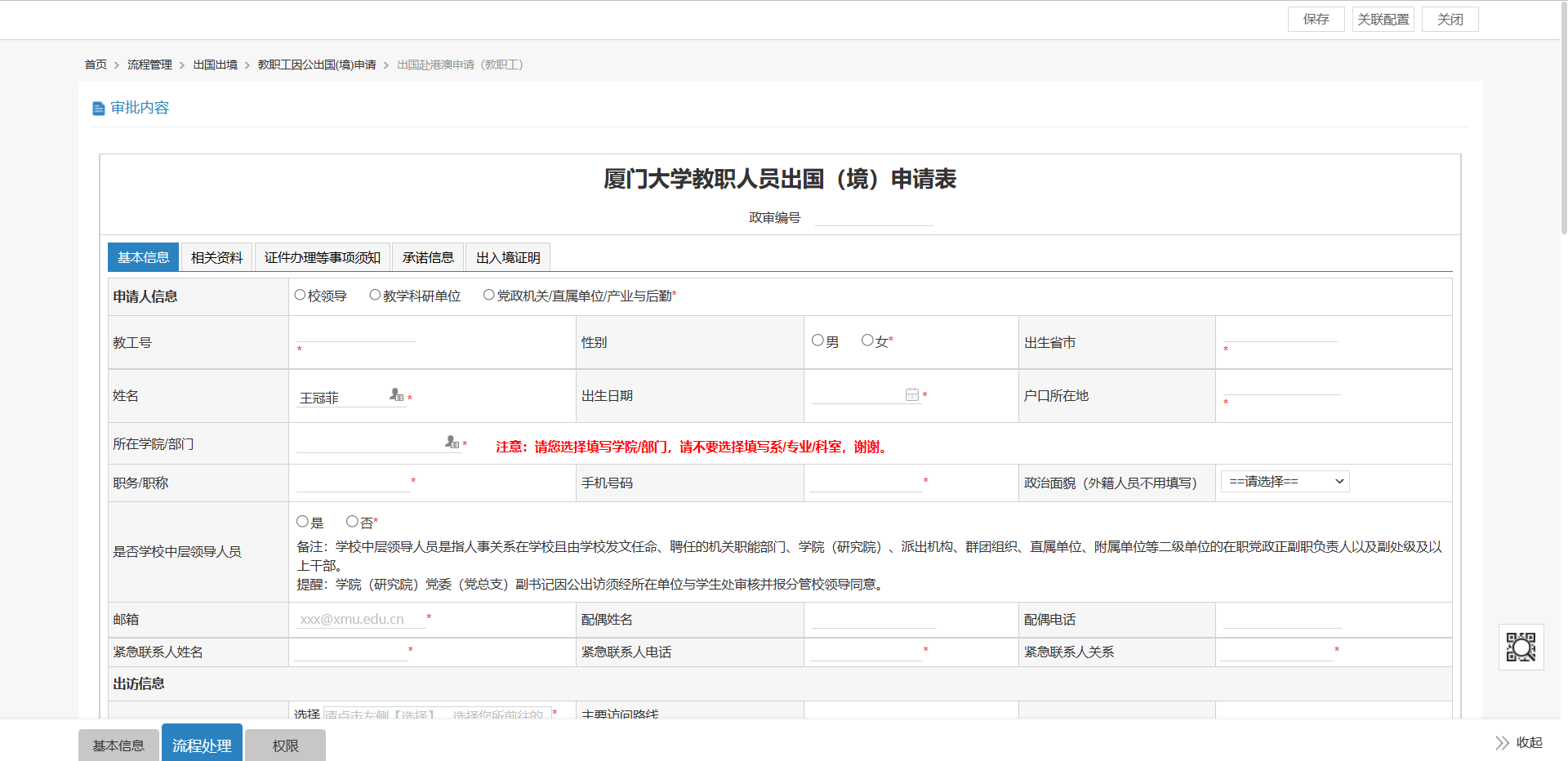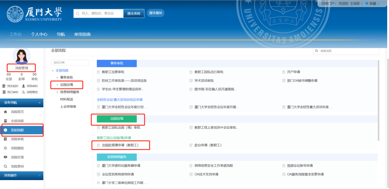 (1)入口:工作台-流程管理-发起流程-出国出境-出国/赴港澳申请(教职工),进入“厦门大学教职人员出国(境)申请表”。