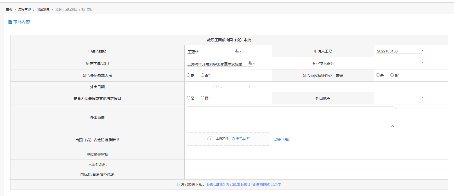 入口:工作台-流程管理-发起流程-出国出境-教职工因私出国(境)审批。