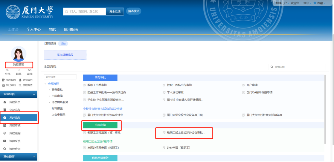 入口:工作台-流程管理-发起流程-出国出境-教职工线上参加涉外会议审批流程。