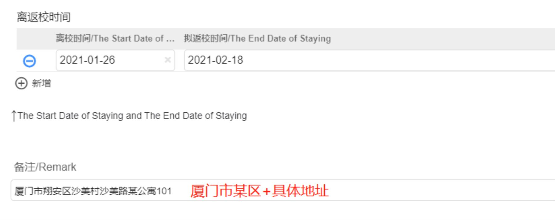 住在校外的同学,务必在备注栏注明校外住宿的详细地址,具体到厦门市,区,街道,小区和门牌号。如厦门市思明区滨海社区海滨东区x栋101。