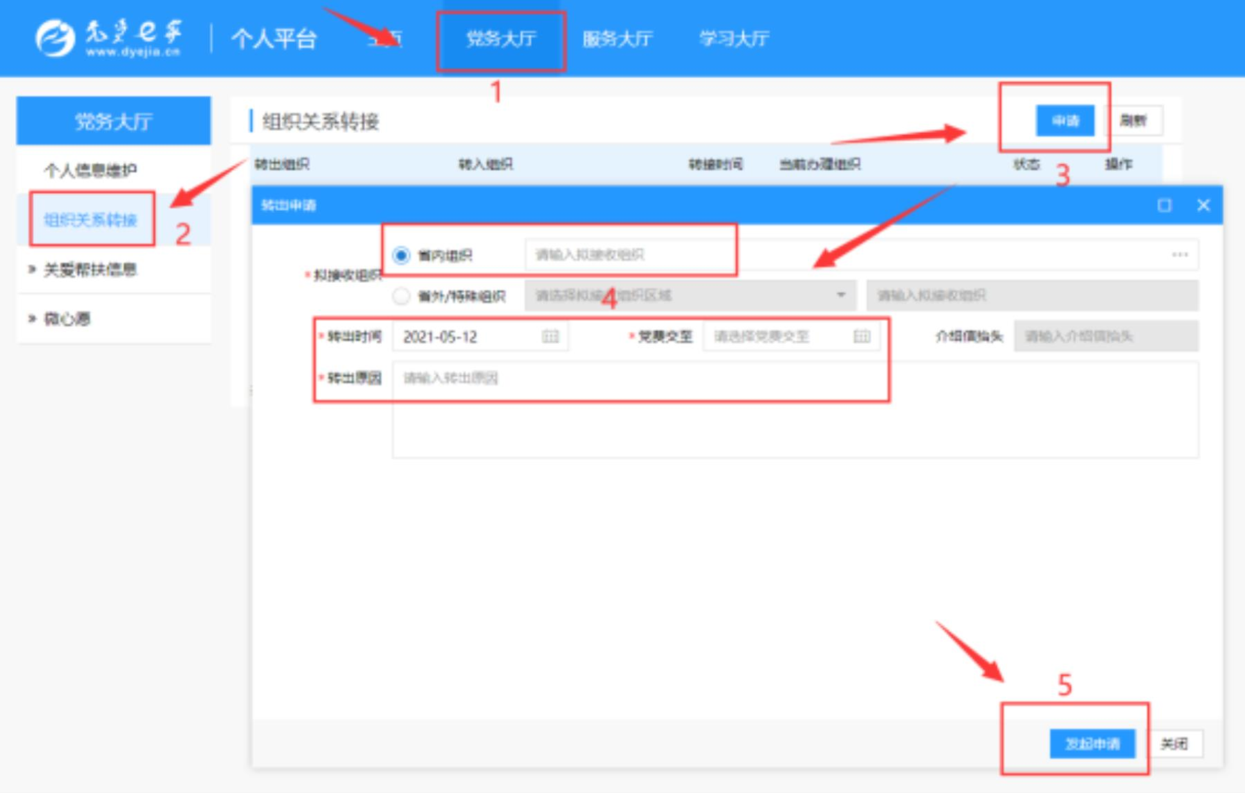 党员登录“党员e家”平台(www.dyejia.cn)→点击“登录”→登录个人平台→进入“党务大厅”→选择“组织关系接转”→点击“申请”→选择“省内组织”→填写拟接收党支部名称→填写其他转出信息→点击“发起申请”,等待党组织逐级审批。如下图所示。