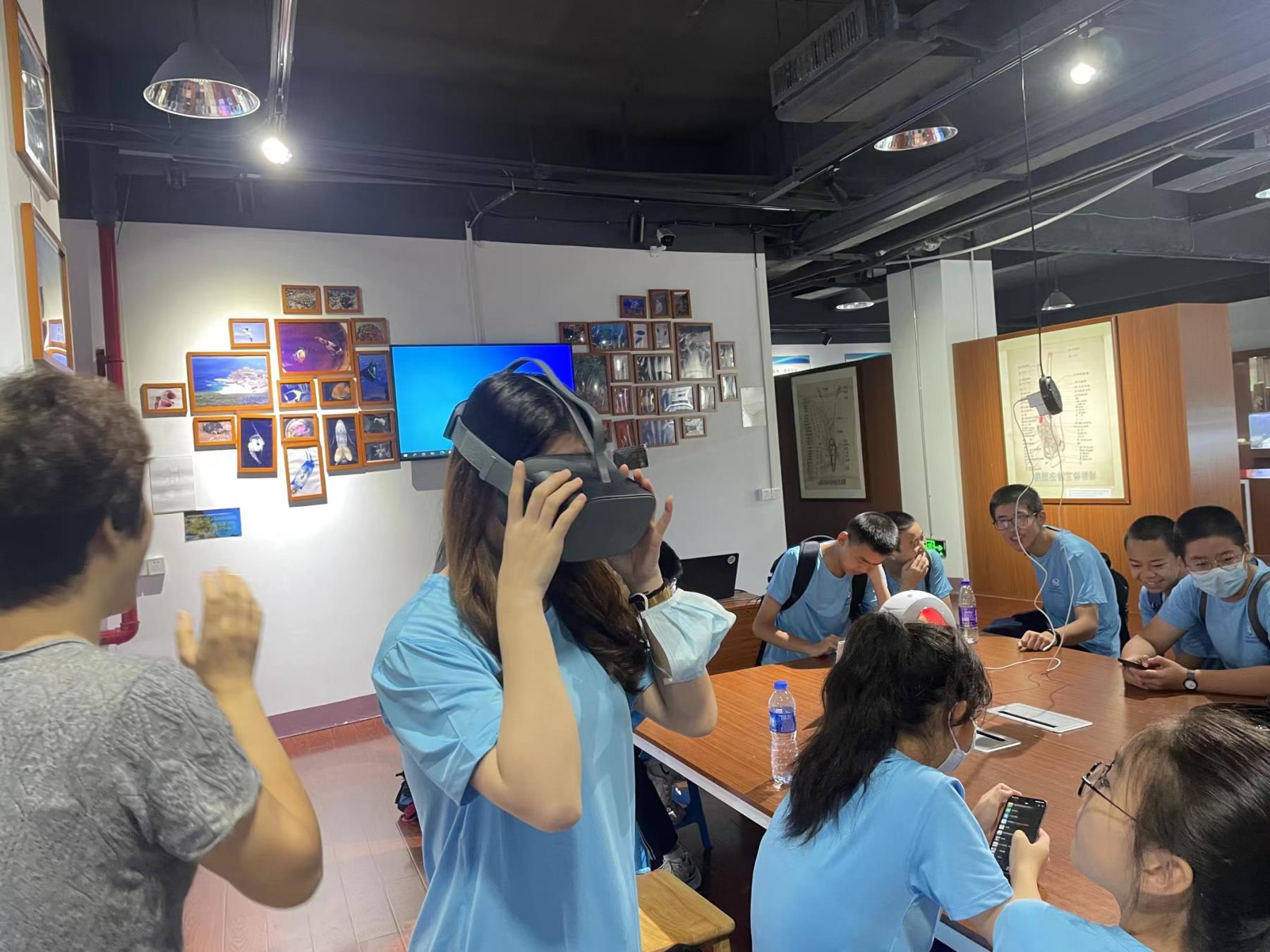 与此同时,另一组同学正怀着新奇与热情在互联网上体验海洋科技博物馆“云参观”,在这里,他们了解了3D数字化学习型的博物馆及其展品。紧接着,大家戴上了VR眼镜,观看科学家从南海拍摄制作的视频,360°的视角仿佛置身于神秘的深海,一切都是那么奇妙。他们还现场参与了海洋知识闯关游戏,现场气氛十分热烈。