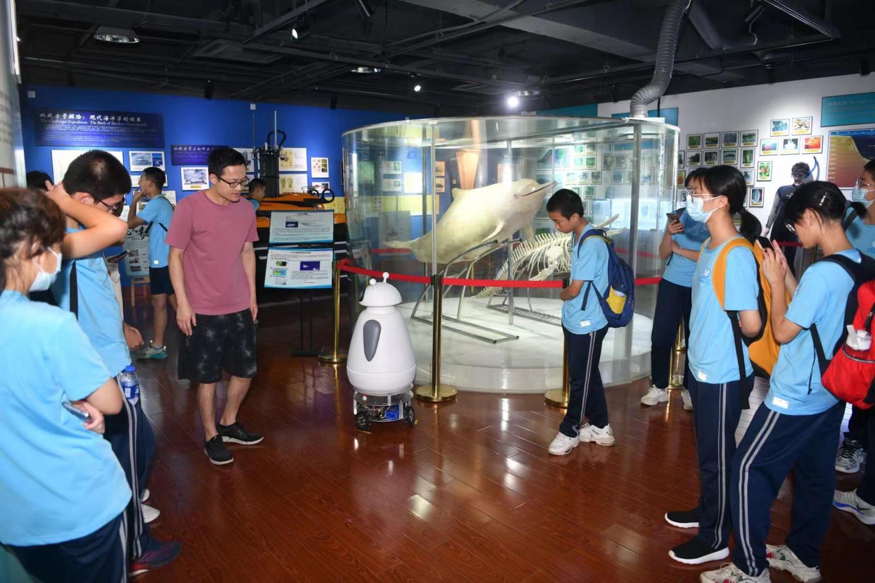 与以往不同的是,本次活动特别增加了“数字化和人工智能”参观环节,旨在让学生在探究型互动中感受海洋科技创新的魅力。 接下来,张朝霞老师带领同学们进入智能化的海洋世界。由厦门大学张宇教授团队研发的人工智能机器鱼,经过建模、编程、组装、调试等一系列程序设计之后,可由手机进行操控,这项技术让同学们惊叹不已,为海洋科技创新和进步点赞。与此同时,他们还热情投入到机器鱼的设计构想中,为机器鱼的防水和密封设计提供了很多建议。此外,博物馆憨态可掬的讲解机器人也吸引了同学们的注意。大家观看了机器人移动、避障和迎宾等,与机器人进行了有趣的语音互动。机器人拓展了海洋科技博物馆的服务内容,极大提升了同学们参与感和体验感。