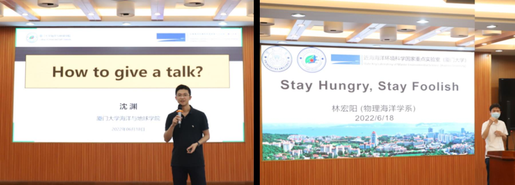 在教师分享环节,沈渊副教授以“How to give a talk”为主题,从制作PPT、准备演讲、回答问题三个方面向同学们传授口头报告的技巧与准则。林宏阳副教授分享了他在厦门大学的学习与科研经历,他勉励在场同学抓住提升自己的关键期,不让青春留下遗憾。