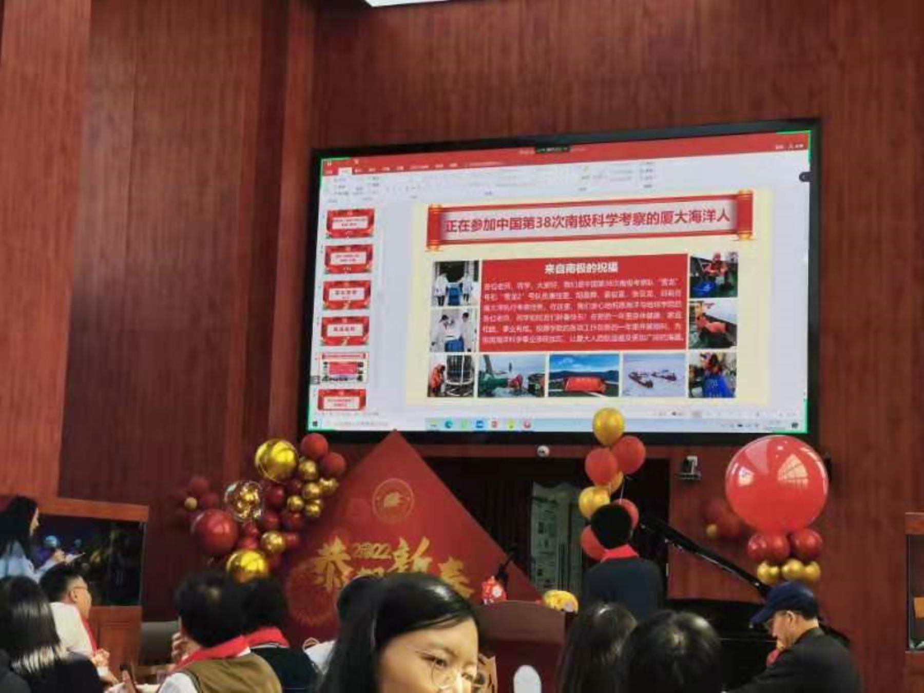 “各位老师、同学,大家好!我们是中国第38次南极科考队队员,目前在南大洋执行考察任务。在这里,我们衷心地祝愿各位老师、同学和校友们新春快乐!祝愿学校各项工作在新的一年里开展顺利,祝厦大人的航迹遍及更加广阔的海疆,为祖国海洋科学事业添砖加瓦!”一份来自南极的新春祝福,经过一天一夜,穿越南大洋送达厦门大学。