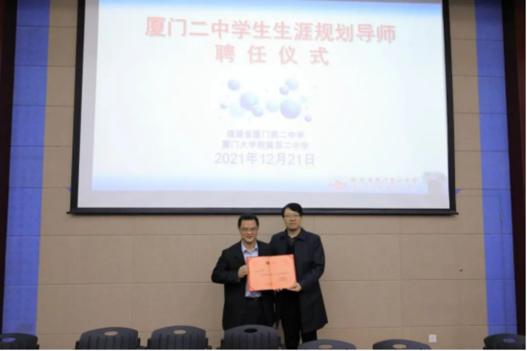 活动最后,厦门二中副校长时建军为张宇教授颁发学生生涯规划指导老师聘书并合影留念。张宇教授生动精彩的演讲和丰富多彩的内容引起了同学们强烈的兴趣,不少同学当场表示报考厦门大学海洋与地球学院的理想,张宇教授也给予同学们未来规划指导意见,勉励同学们在学业中取得长足进步并顺利如愿。