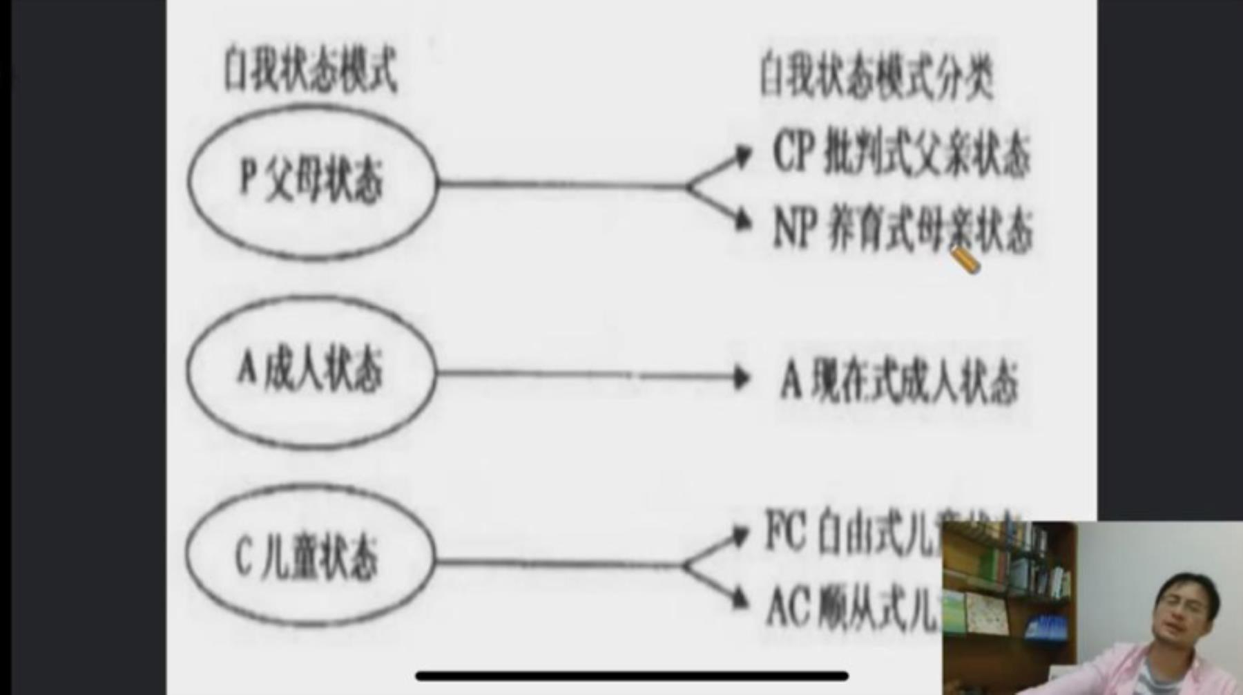 随后,郑老师邀请同学们进行了一次在线心理测试,通过回答50道题目,可以获得5种自我状态的分数,分别是CP、NP、A、FC、AC,由此引出TA理论。郑老师认为不同分值并没有优劣之分,如何理解和转化才更为重要。他指出,孩子在刚出生时是完全依赖父母的,因而一开始建立的心理地位是“我不好,你好”的状态。通过抚养者恰当的养育方式,孩子会慢慢学会思考、挖掘潜力、肯定自身的能力,建立信心。反之,如果在此过程中经常遭受负面的评价和批评,很可能就会形成负面的心理地位。这种负面的心理地位需要及时察觉和矫正。