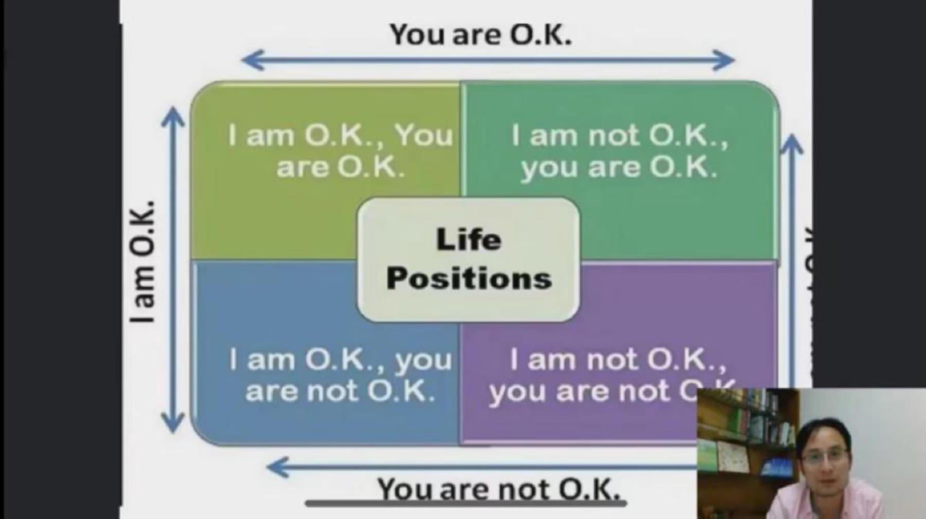 关于自我认知,郑老师通过“当遭遇挫折的时候,是选择将问题归咎于自身,还是归咎于外部因素”,“对待比自己更加优秀的人时,是选择超越他们还是自愧不如”等问题,引发同学们的思考,并借助于OK框图来进行分析,他指出,不同的选择对应了不同的状态,由此帮助同学们更加清晰自我的定位。