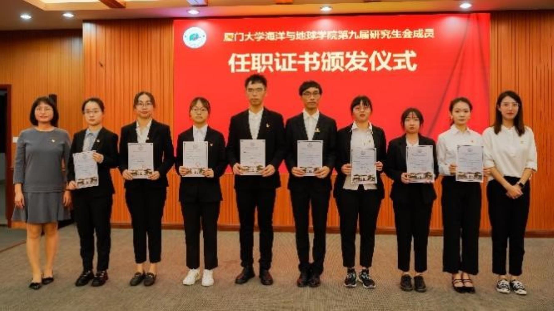 厦门大学研究生会翔安校区分会主席团成员谢榕顺同学代表校研究生会进行发言,他对会议的召开表示热烈的祝贺,肯定了我院研究生团总支、研究生会出色的工作成果,祝愿学院再续佳绩。随后,大会为海洋与地球学院第九届团总支、研究生会委员颁发任职证书、海洋与地球学院优秀学生干部荣誉证书,对他们一年来的工作表示肯定与鼓励。