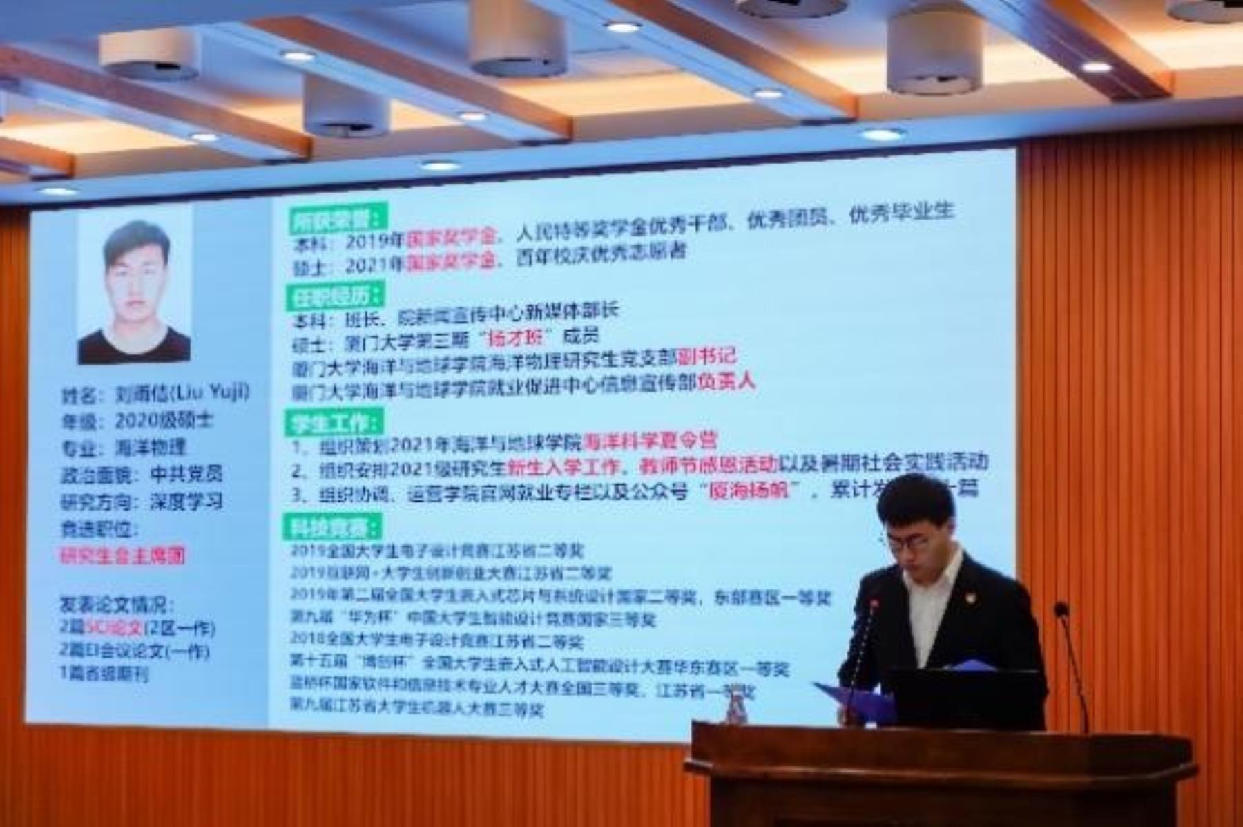 大会审议并通过厦门大学海洋与地球学院第十届团总支书记、副书记候选人建议名单,第十届研究生会主席团候选人建议名单,候选人依次上台进行竞选演讲。在宣读大会选举办法后,大会通过无记名投票方式,选举产生黄熠锋、吕梦蓉、李诗梦等同学为学院第十届研究生团总支书记、副书记,刘雨佶、张若洋、康思静等同学为学院第十届研究生会主席团成员。