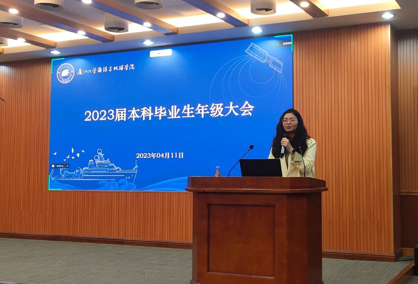 为扎实做好海洋与地球学院2023届本科毕业生工作,做好毕业生毕业、就业指导,进一步加强学风建设,4月11日晚,学院在希平楼C2-403报告厅召开2023届本科毕业生年级大会。辅导员张莉莉、本科教学秘书陈雅琪出席会议并就本科生就业、毕业相关工作做了说明,2023届毕业生通过线上线下相结合的方式参加会议。