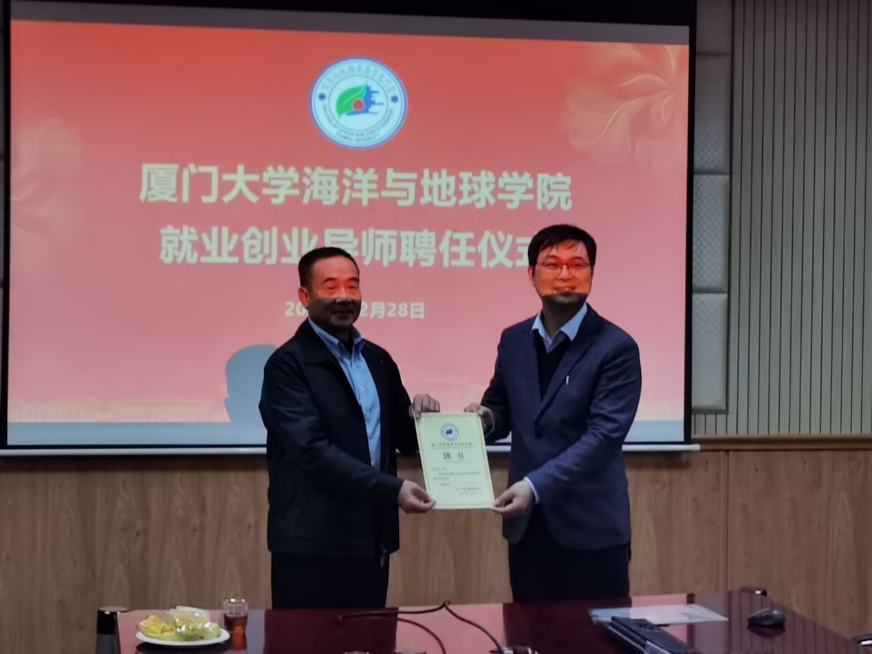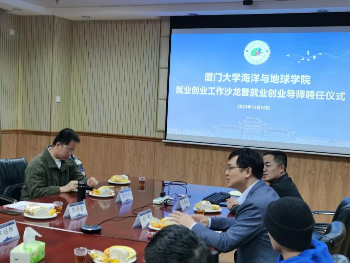 12月28日下午,我院就业创业工作沙龙暨就业创业导师聘任仪式在希平楼C2-207成功举行。福建省远洋渔业发展促进会会长、原福建省海洋与渔业厅党组成员、副厅长、巡视员(正厅级)陈泽銮教授、学院副院长徐鹏教授、团委副书记徐惠聪以及学院本硕博学生代表参加了会议。会议由徐惠聪主持。