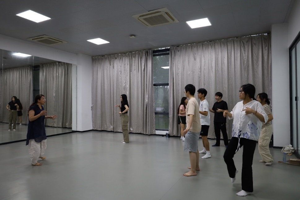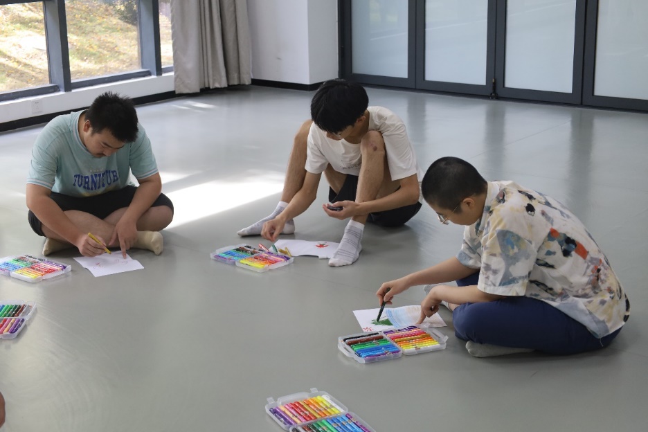 三场活动中,廖彬彬老师主要通过舞蹈的形式让同学认识身体、感知身体、唤醒身体。她让同学们构建一个想象中的泡泡,引导同学们体悟内心的边界感及与外界的联系,同学们循序渐进地分享了对学习、生活和交友等方面的困惑。她根据同学们的困惑引导他们进行编舞,模拟如何通过舞蹈表达并解决内心的问题。廖彬彬老师充分发挥同学们的自主创作能力,引导他们通过舞蹈展现同学们和同伴一天的经历,让同学们更深刻地理解了身体语言在情感交流中的作用。除了表达内心困惑、展现自身经历,廖彬彬老师在最后一天的活动中还引导同学们在纸上随机绘画,然后用身体舞出他人绘画中的内容和情感。