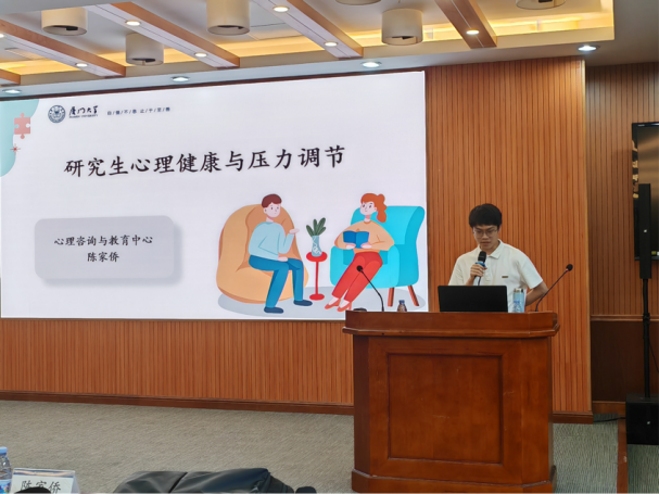 厦门大学心理健康与教育中心陈家侨老师开展了主题为《研究生心理健康与压力调节》的讲座。他以深厚的专业知识和丰富的实战经验,为在场的同学们详细讲解了应对学术压力、情绪管理、时间规划等多方面的实用技巧,鼓励大家用积极的心态和科学的方法迎接未来的学习生活。