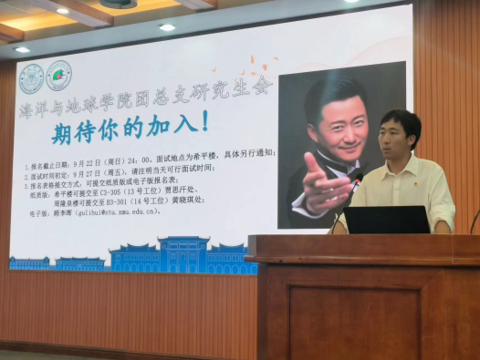 研究生团总支贾思汗学长向新生介绍学院研究生团总支、研究生会。在学院党委领导、团委指导下,学院研究生团总支、研究生会从同学们最需要、最关切的地方出发,形成了“思想领航、学业导航、科创引航、实践护航、服务助航、文体续航”等多方面的服务同学成长成才的活动体系,为同学们开展了“职海扬帆”“听,海的声音”“海洋科技文创大赛”等同学们喜闻乐见的活动。