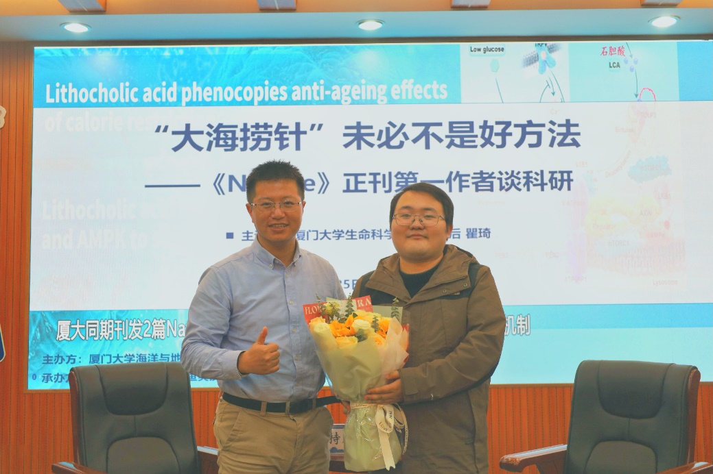 12月25日晚,近期以第一作者同时发表两篇《Nature》正刊的厦门大学生命科学学院博士后瞿琦做客海洋与地球学院,向同学们分享多年来的科研经验以及论文发表的艰辛过程。此次活动由微型生物生态学第二研究生党支部、鱼类及浮游生物研究生党支部和学院研究生会联合主办,讲座采用轻松幽默的访谈形式,吸引了近100名本科生和研究生参加。学院团委书记江子扬主持本次活动。
