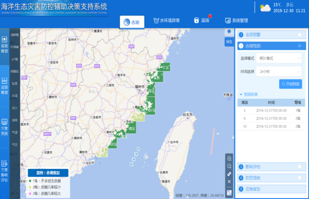 以台湾海峡西侧海洋生态灾害多发海域为研究及应用示范区,致力于海洋生态环境监测和主要生态灾害的防控需求,在目标海域已有部分监测平台资源基础之上,整合集成国产多基海洋生态环境观测平台,构建44套多基监测单元组成的海洋生态立体监测系统,实现对区域海洋关键生态环境要素的实时立体监测,获取含生化、水文气象、动力和光学等不重复监测要素不少于50个;进而基于多源监测数据,建立生态灾害统计预报模式、生态动力模式和漂移轨迹预测模式、灾害防控技术体系和灾害影响评估体系,集成构建生态灾害防控辅助决策支持系统,实现从实况、预测、评估到防控的海洋生态灾害全流程监测与防控辅助决策,实现对区域主要海洋生态灾害的科学化、智能化防控辅助决策支持。目前进入示范试运行,并应用于福建省海洋生态灾害监测与防控。