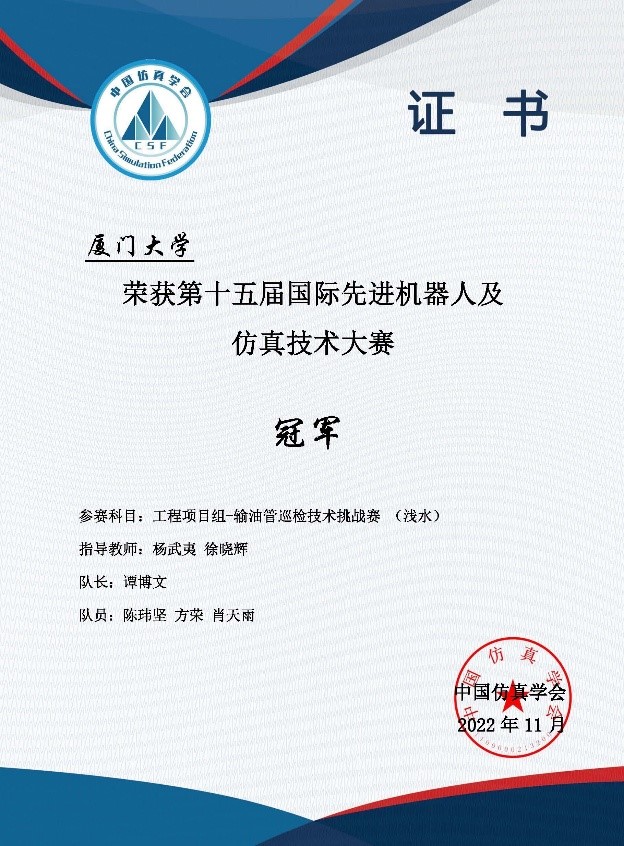 近日,第十五届国际先进机器人及仿真技术大赛(原国际水中机器人大赛)公布获奖名单,我院水下探测机器人创新俱乐部联合航空航天学院派出6支队伍参与比赛,获一等奖2项(含冠军1项)、二等奖3项、三等奖1项,2人获评为优秀指导老师。
