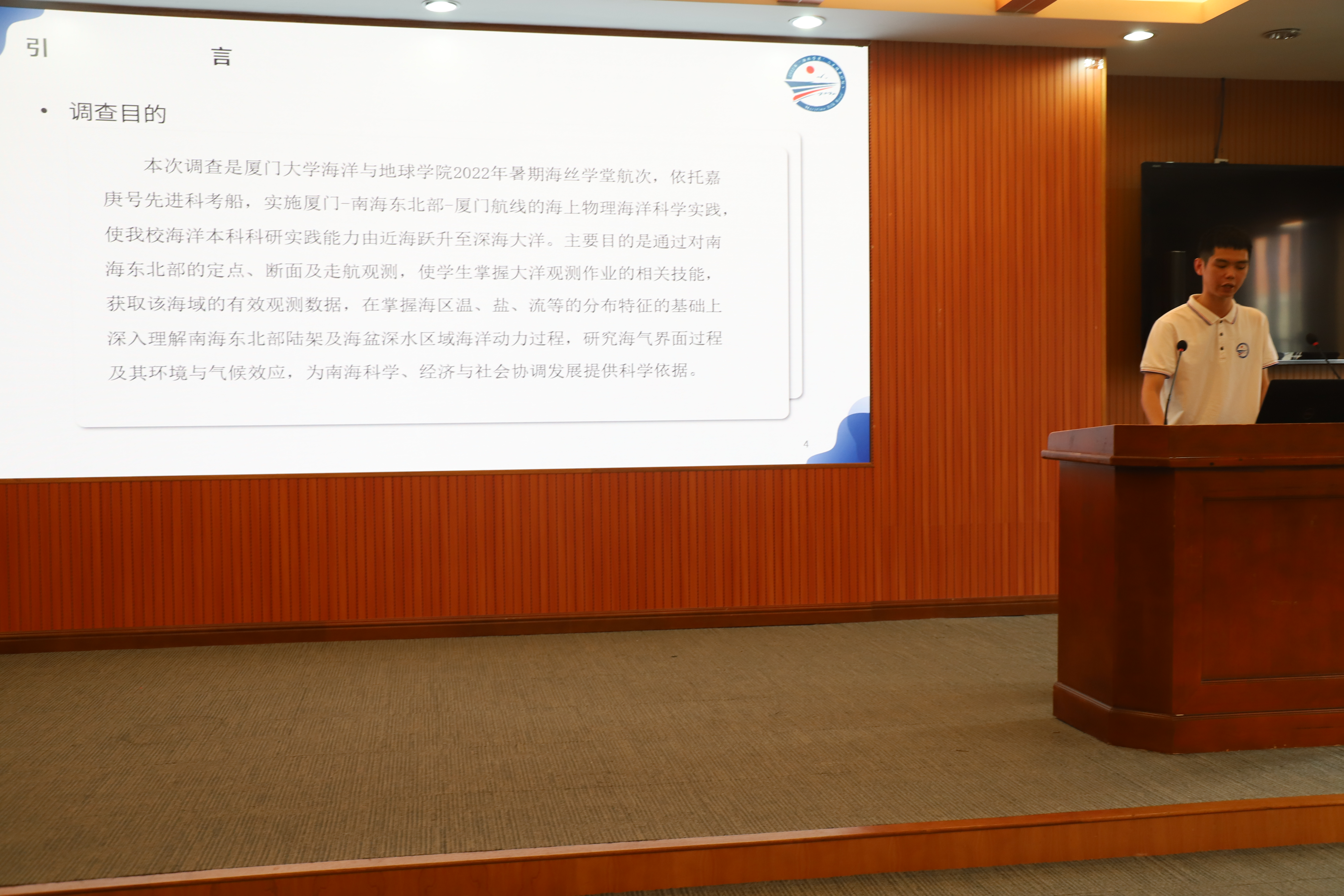 海洋与地球学院张润、唐甜甜两位老师分别担任两航段首席科学家。张润代表项目组对2022年“海丝学堂”人才培养计划作了全面总结。他从参与师生规模、航次内容、以及各个专业组的报告数据汇总等方面为概括了此次活动的收获及成果;此外,他还展示了“海丝学堂”海上科考作业以外的主题活动及日常生活。