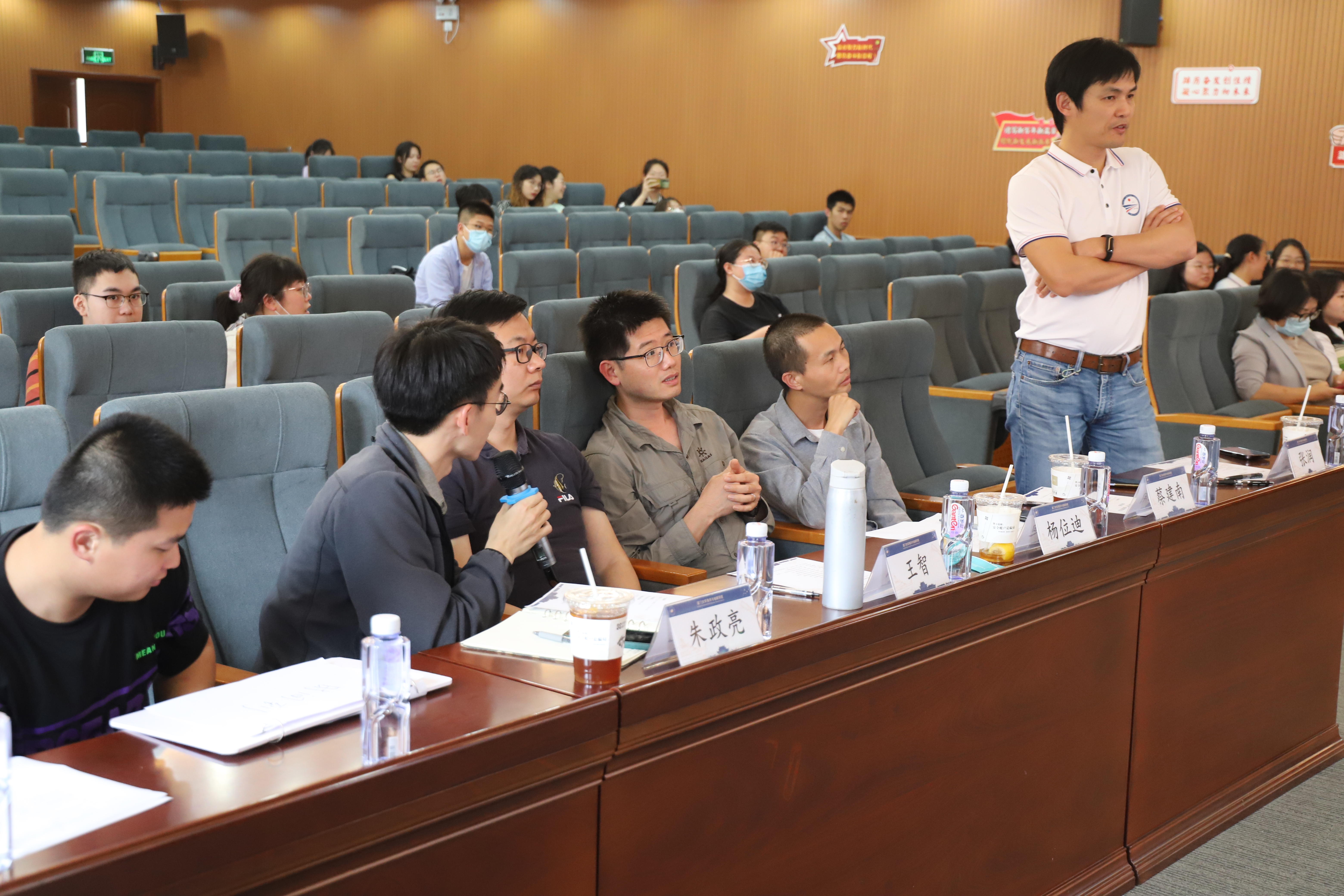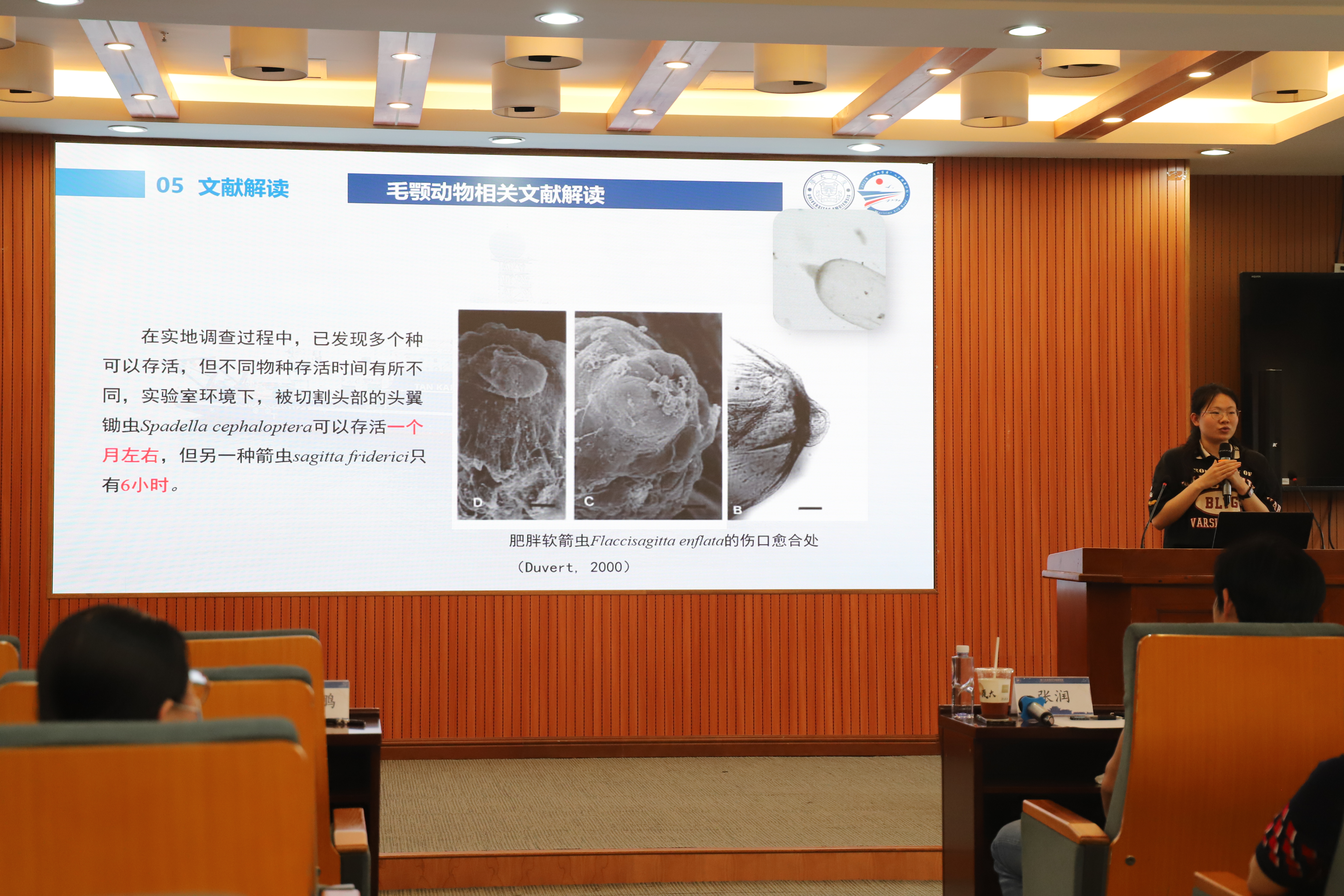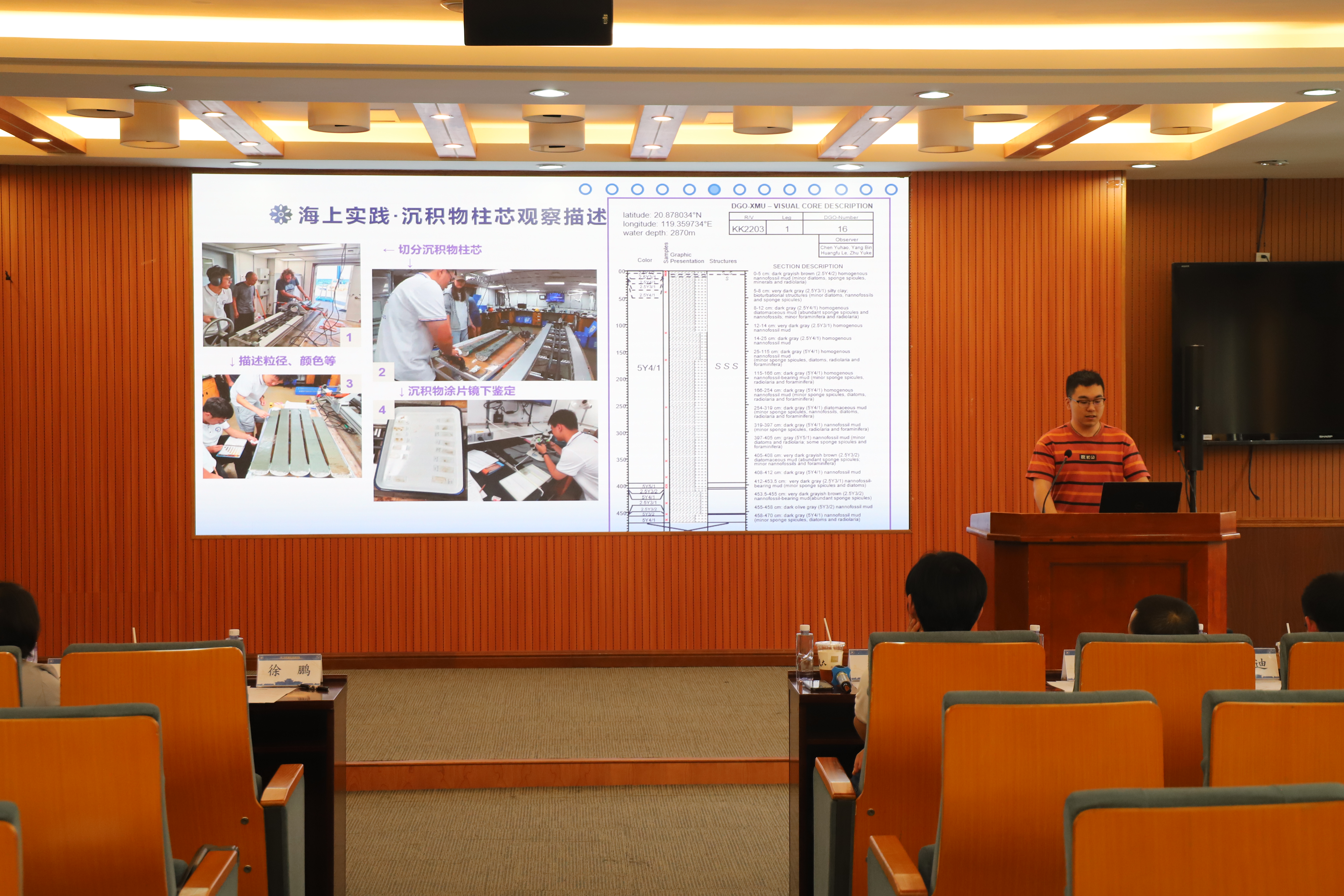 随后,来自各专业组的学生们对本专业的研究调查成果先后作航次报告,依次由海洋物理专业组的张振宇、海洋化学专业组的唐松盈、浮游生物组的杨晨昱、大型底栖动物组的曾樱芝、地质海洋组的陈宇皓、物理海洋专业组的张文翔进行了展示。评委老师在同学汇报结束后,对报告中的问题进行提问、点评。此外,口头汇报开始前还进行了海报展示环节。