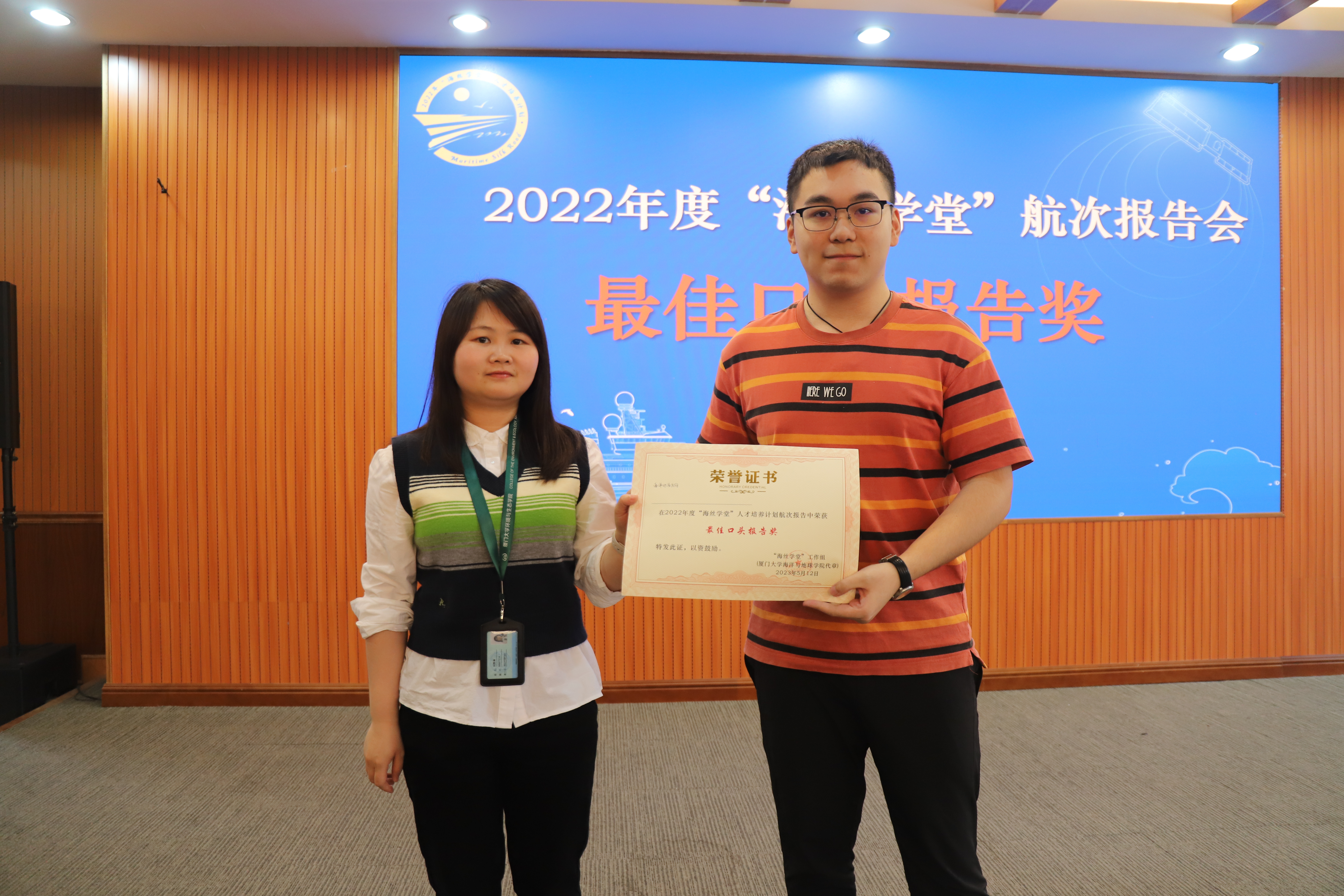 最终,在10位评委老师的共同评分下,海洋化学组获得了“最佳墙报奖”,海洋地质组获得了“最佳口头报告奖”,由航次首席科学家唐甜甜和项目指导老师刘凯琳颁奖。