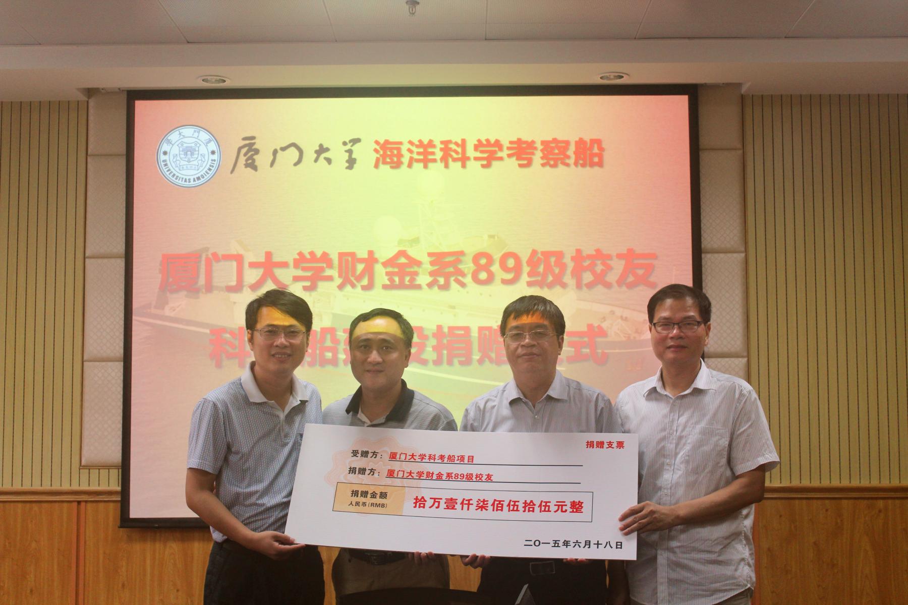 厦门大学坐落于东海之滨,因海而生,伴海而长。作为我国海洋学科的发祥地之一,厦门大学经数十年发展具备了雄厚的海洋学科研究实力。而能够拥有一艘性能卓越的大型海洋科考船是厦大数代海洋人的梦想,更是历史的呼唤!百年前,校主陈嘉庚先生发出“力挽海权、培育专才”的铮铮誓言,此后厦大海洋人锐意进取,不息自强,为了这一海洋科学最为美丽高远的信念奋斗拼搏、传承开拓,将一份份力量的源泉汇聚成蔚蓝梦想的汪洋。6月18日下午,厦大校友廖山海、陈春晖喜归母校,代表财金系89级全体校友为厦门大学的科考船建设捐赠拾万壹仟柒佰伍拾伍元的善款,捐赠仪式由厦大海洋与地球学院党委书记邱七星主持,副院长柯才焕、厦大校友总会郑辉以及科考船项目成员出席了捐赠仪式,共同见证这一过程简单而气氛庄重的时刻。
