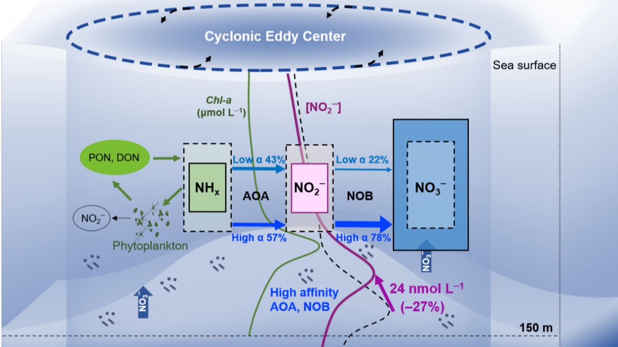近日,厦门大学海洋与地球学院、近海海洋环境科学国家重点实验室张瑶教授团队在海洋中尺度涡旋的生物地球化学响应方面取得重要研究进展,相关成果以“Reduced nitrite accumulation at the primary nitrite maximum in the cyclonic eddies in the western North Pacific subtropical gyre”为题发表于Science Advances.该研究综合利用物理-化学-生物多学科海洋现场观测资料,首次揭示了西北太平洋副热带流涡区中尺度气旋涡所诱...